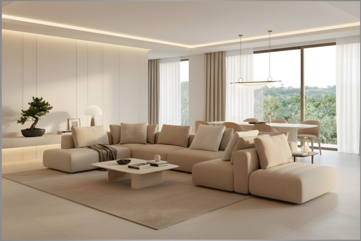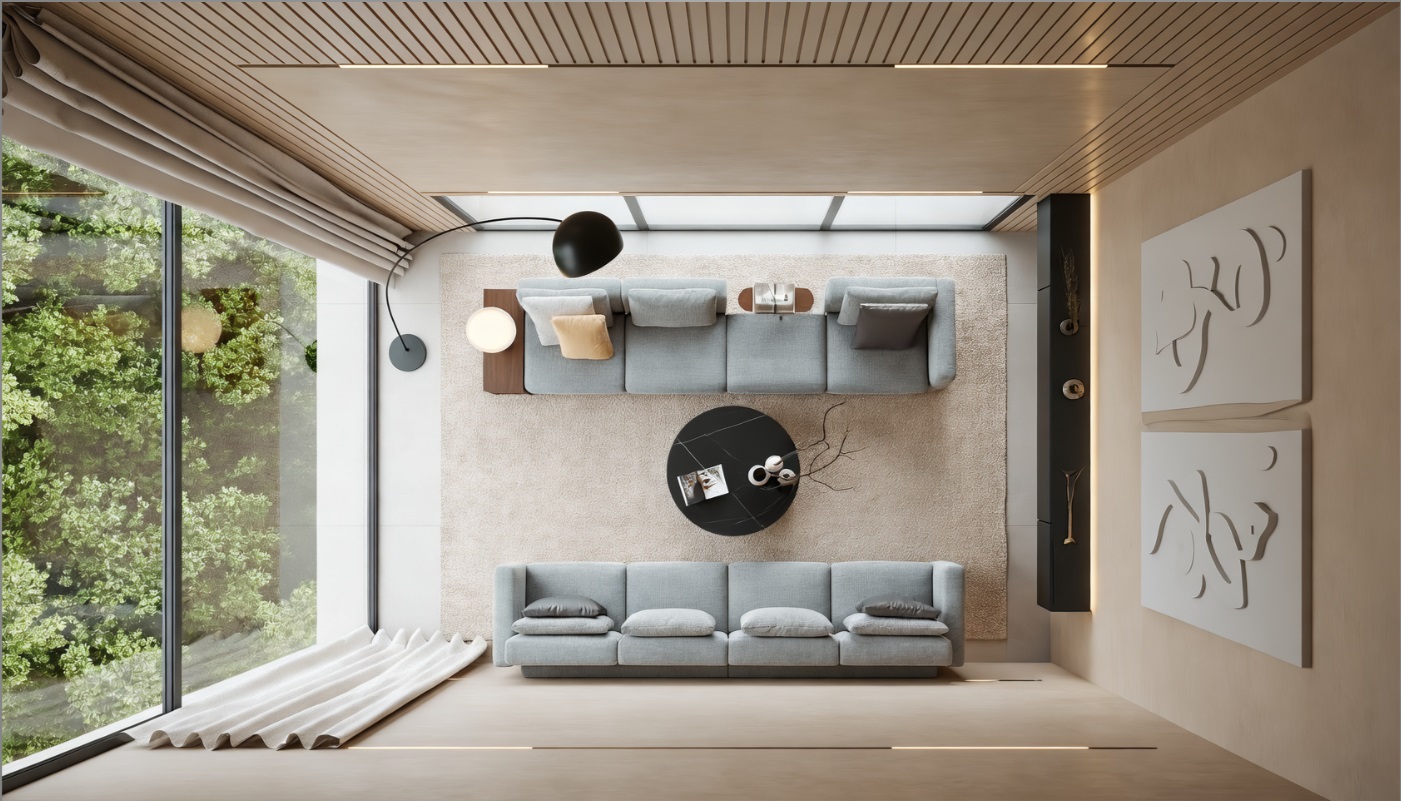 כל חלק מחולק בקפידה כדי לתת מענה לצרכים שונים – שזלונג למנוחה, ישיבה מרווחת לכל המשפחה לאיסוף, וכורסה ממוקמת אסטרטגית ליצירת אזור עבודה או פינת קריאה נעימה.