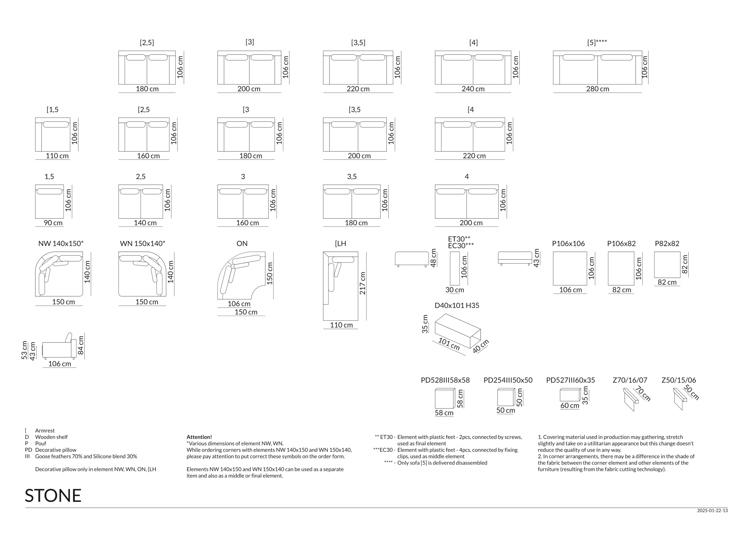 ה-STONE זמינה במגוון מודולים ישרים, פינתיים או חצי אי, כך שתוכלו ליצור את נווה המדבר שלכם. 34 האלמנטים הליניאריים והמודולריים וחמשת הדומים שלה מעניקים לכם חופש קומפוזיציה מוחלט, מצורות בסיסיות ועד פינות וסידורים עגולים. לכן, תוכלו להתאים אותה לחלל המגורים שלכם לזרימה הטובה ביותר האפשרית. משענות היד המרופדות זמינות בגרסאות גבוהות ונמוכות. ניתן גם להוסיף מדף בין האלמנטים כדי לשמור תמיד על חומר הקריאה, השלט או המשקאות שלכם בהישג יד.