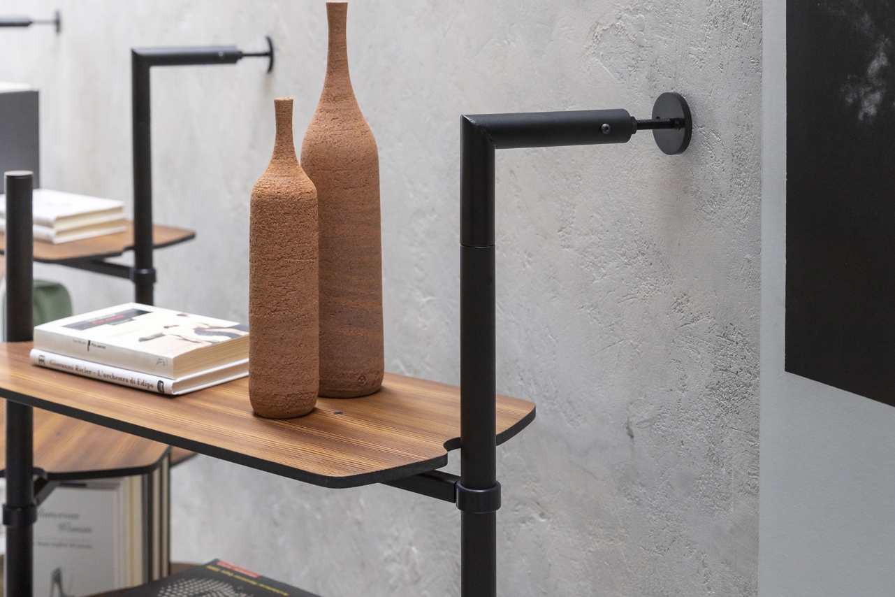 Levante הוא כוננית מודולרית ממתכת צבועה בצבע שחור מט, עם קיבוע תקרה או קיר.
