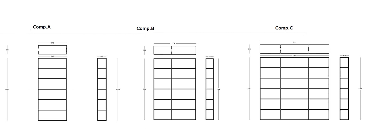 ארון הספרים Easy Irony הוא מודולרי, כך שהמידות משתנות בהתאם לתצורה, אך מידות נפוצות הן גובה של 226 ס”מ ועומק של 32 ס”מ.
