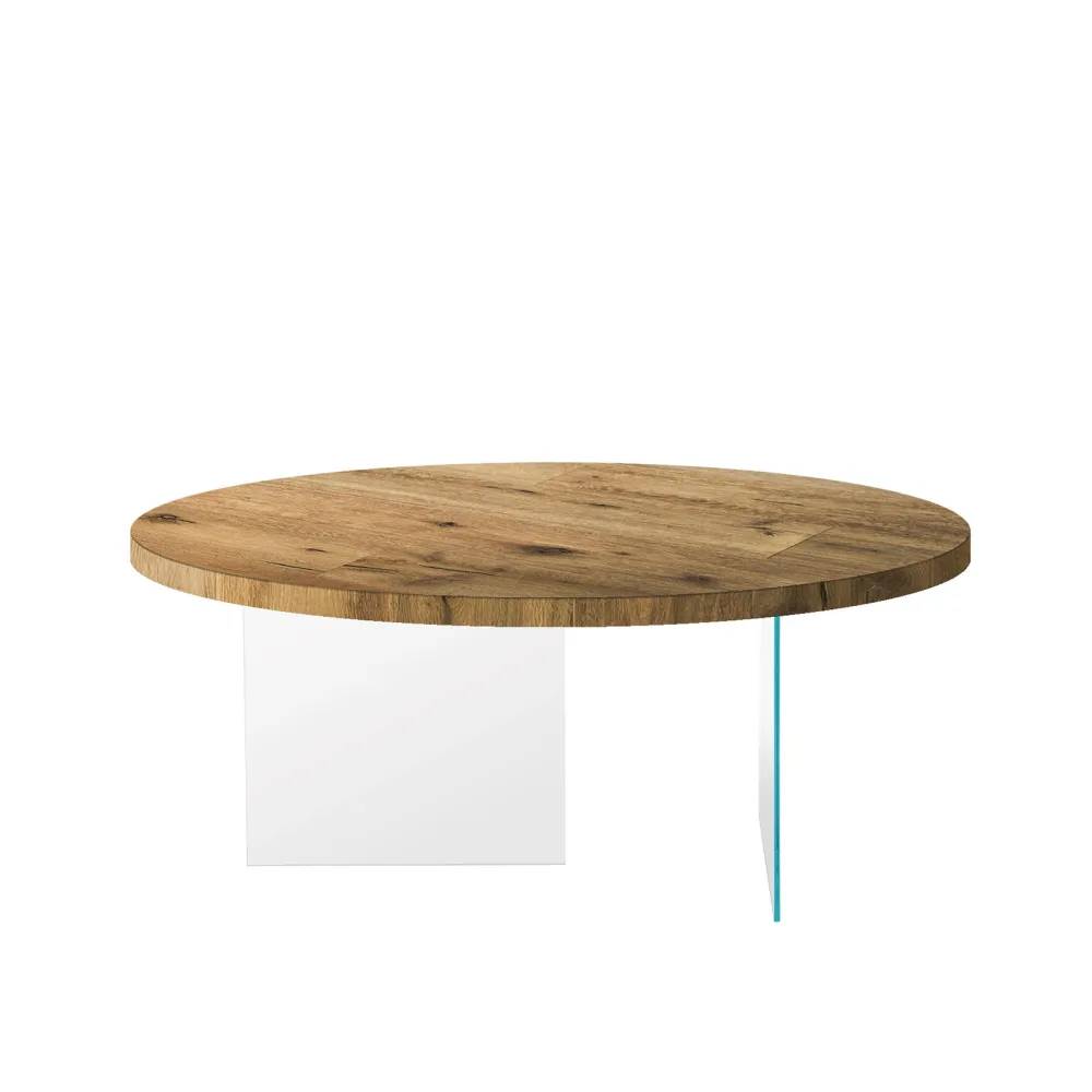 העיצוב הייחודי של שולחן זה משלב בין רגליי זכוכית עדינות ובעלות צורה בלתי רגילה, לבין פלטת עץ מלא יציבה ומלאת נוכחות, הנראית כאילו מרחפת באוויר.