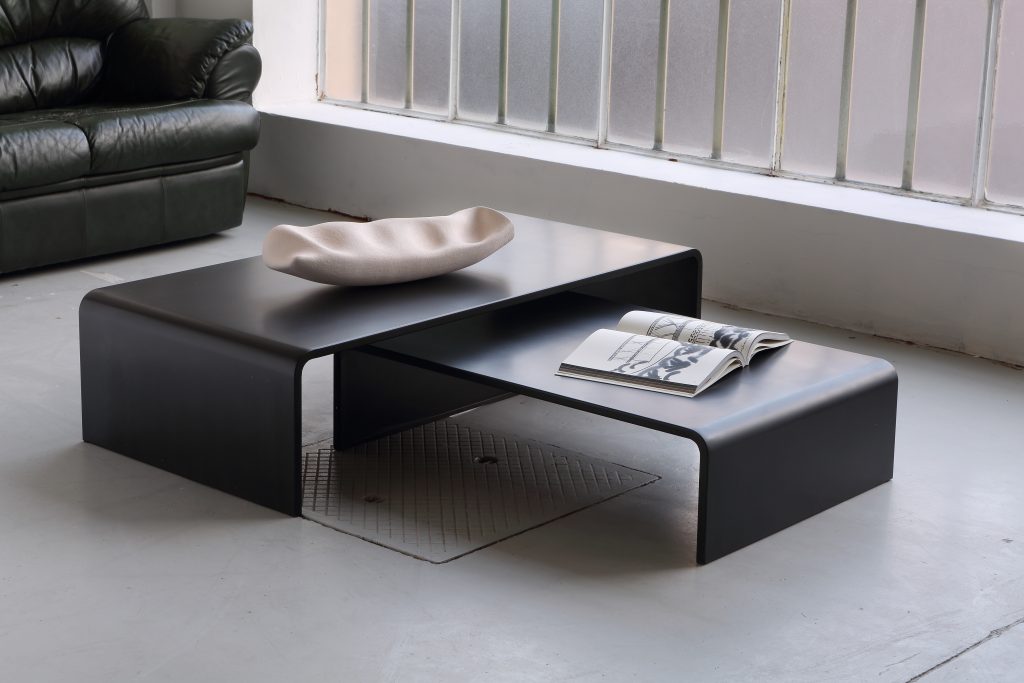 מציגים את שולחן הקפה המלבני הנמוך מדגם Solitaire, שילוב מדהים של סגנון ופונקציונליות. פריט ייחודי זה, העשוי מפלדת פח שחורה שעברה פוספטיזציה עם משטח לבן מובלט, מפתח פטינה עשירה עם הזמן, ומשפר את הקסם והאופי שלו.